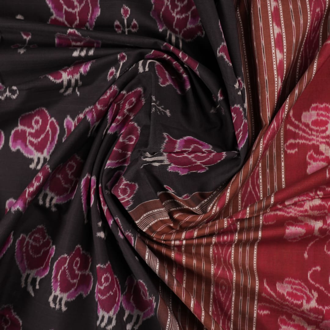 Full layout of the black and brown Sambalpuri cotton saree displaying motifs across the body and pallu.