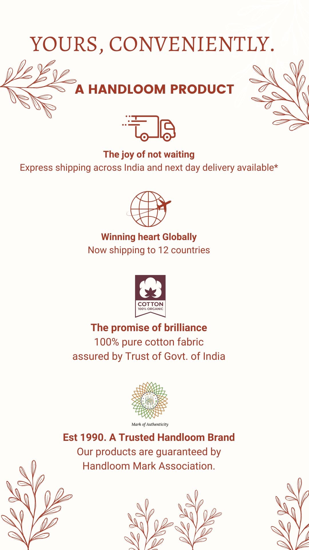 यह एक वास्तविक हाथ से बुना हुआ टुकड़ा है, सेल्वेज और बुनाई में असमानता की उम्मीद की जा सकती है और नियोजित पारंपरिक रंगाई विधि के कारण रंग फीके पड़ सकते हैं या निकल सकते हैं।
