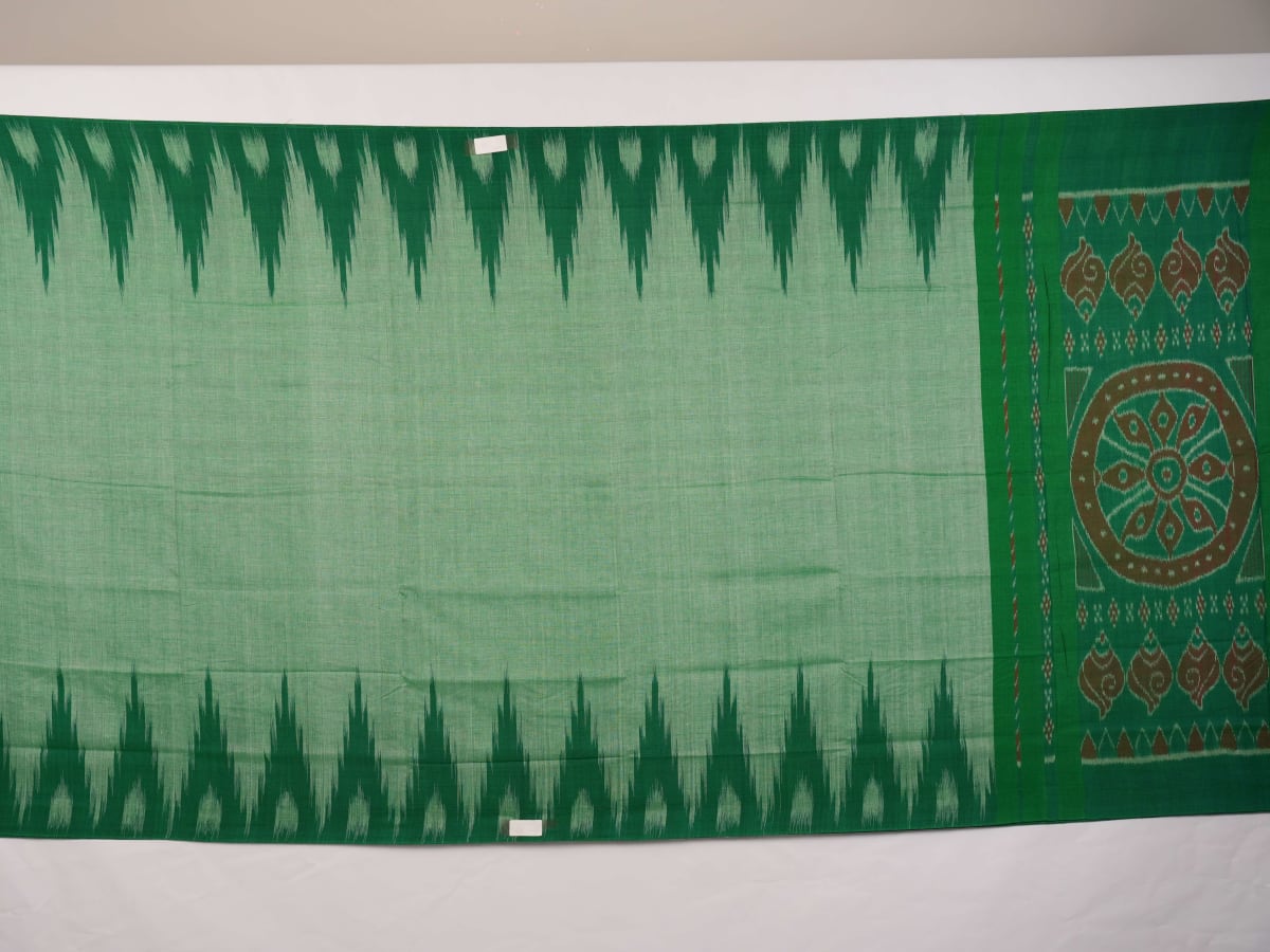 Celebrate the understated elegance of Odisha’s weaving heritage with this stunning Green Sambalpuri Cotton Saree. Handcrafted with meticulous care, the plain green body draws focus to the majestic wide border, a testament to the skill of our master artisans. This saree is designed for the modern woman who finds strength in tradition, offering a breathable, sophisticated drape that transitions seamlessly from the boardroom to an evening gathering. It is more than just a garment; it is a piece of living history that reflects your commitment to authentic craftsmanship.