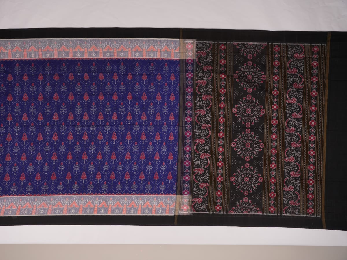 Experience the soulful elegance of Odisha with this handcrafted Blue and Black Sambalpuri cotton saree. The deep azure body, adorned with meticulously hand-woven motifs, transitions into a striking wide black border that speaks of strength and sophistication. Every thread captures the rhythmic precision of traditional Ikat weaving, offering a breathable yet luxurious drape for the modern woman who honors her heritage while navigating the professional world.