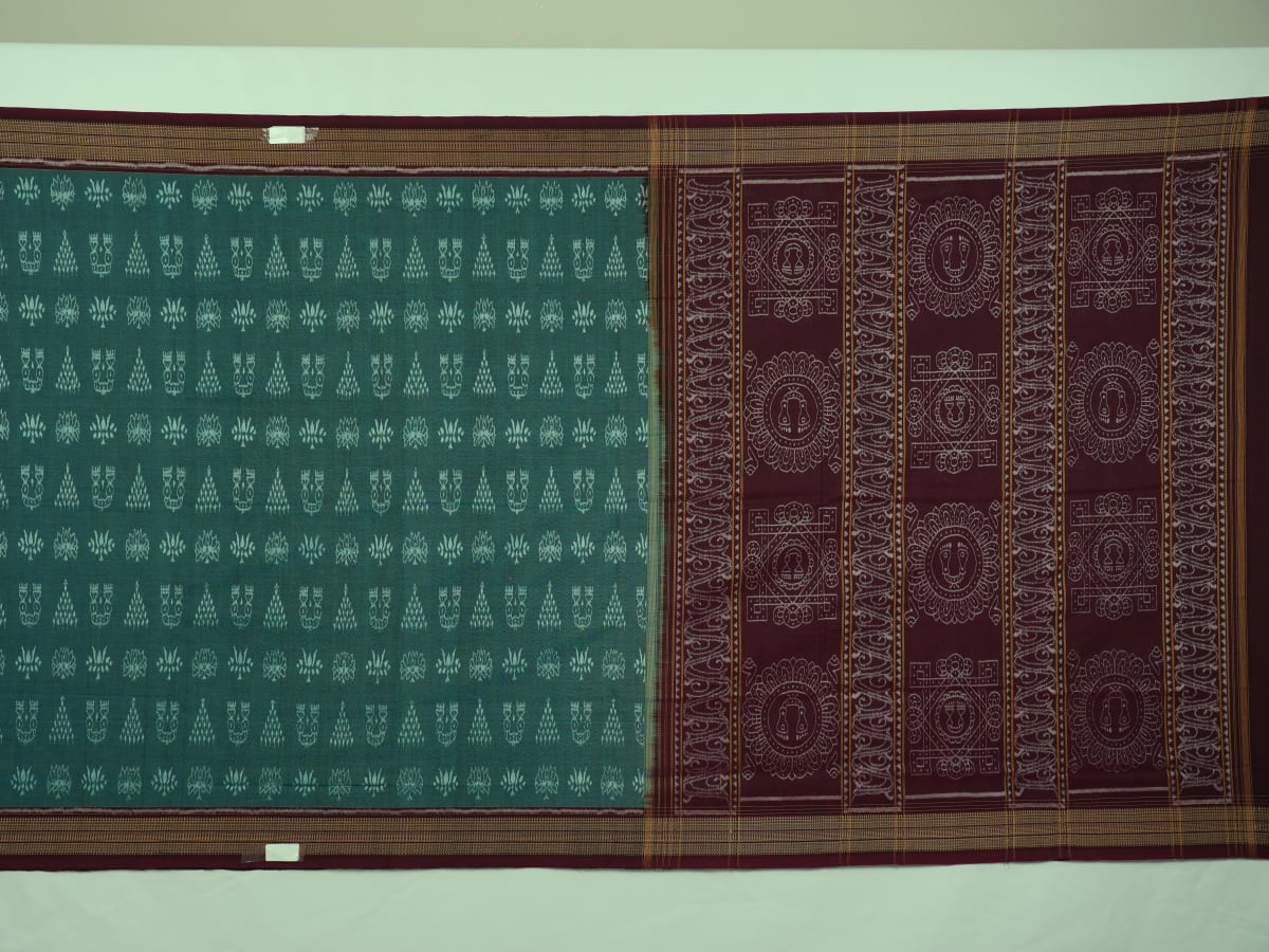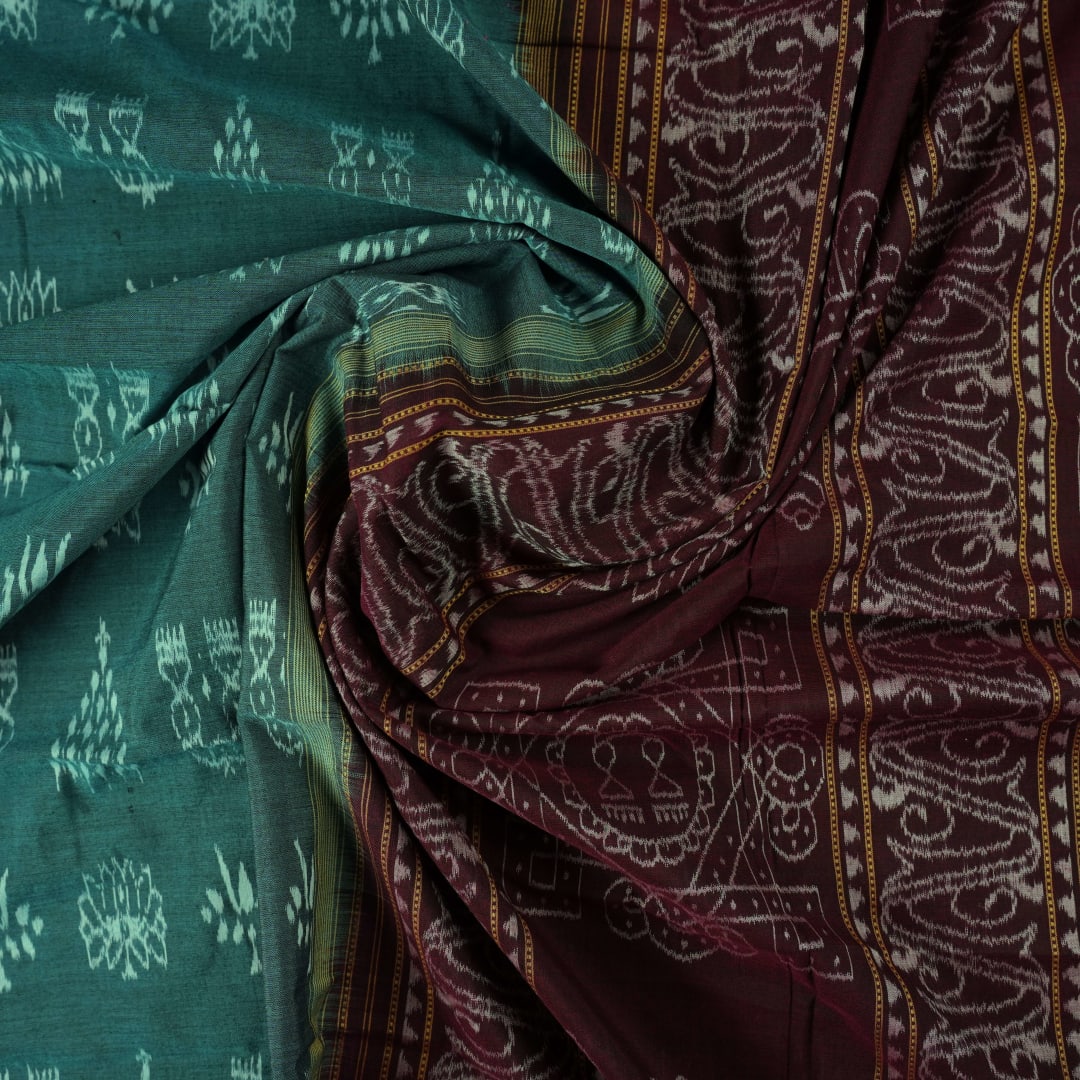 Experience the rustic elegance of Odisha with this hand-woven Sambalpuri cotton saree, where a verdant green body meets a deep maroon border in perfect harmony. Each intricate motif is a testament to the ancient 'Bandha' tie-dye technique, meticulously crafted by master weavers to reflect the rich cultural heritage of the region. Designed for the modern woman who balances professional excellence with an appreciation for tradition, this saree offers breathable comfort without compromising on sophisticated style. It is more than just a garment; it is a piece of wearable art that celebrates your independent spirit and timeless grace.