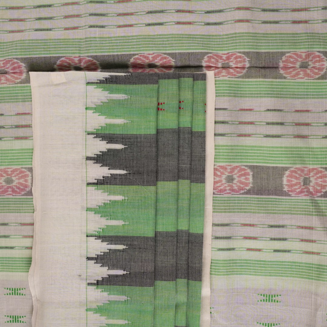 Experience the understated elegance of Odisha's textile heritage with this hand-loomed Green and White Sambalpuri Cotton saree. Featuring crisp, traditional stripes and a perfectly proportioned medium border, this piece celebrates the meticulous 'Bandha' artistry that defines Sambalpuri weaving. It is an ideal choice for the modern professional who seeks a blend of comfort and cultural pride, offering a breathable drape that carries the soul of Indian craftsmanship from dawn to dusk.