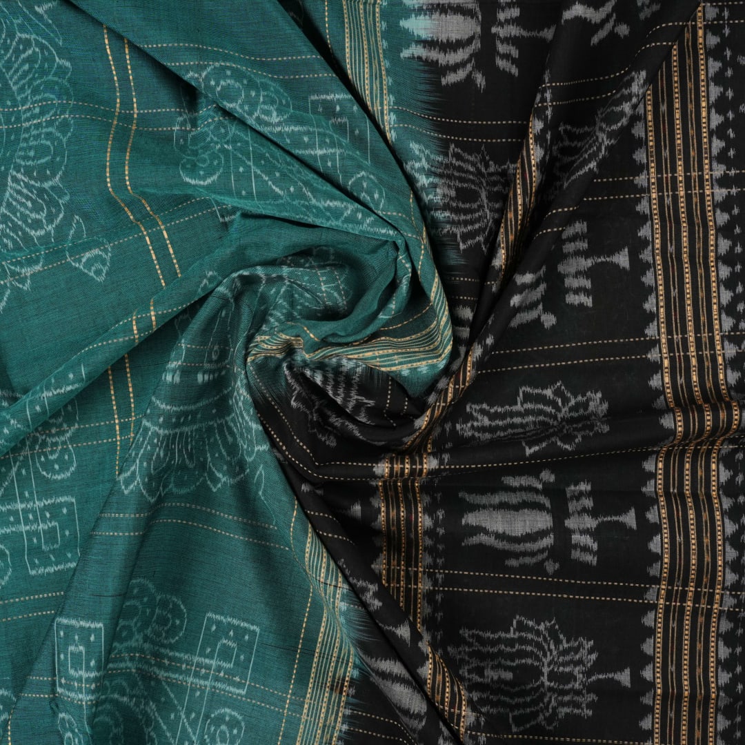 Embrace the soulful heritage of Odisha with this hand-woven Sambalpuri cotton saree, where vibrant green meets the profound depth of a classic black border. Each motif is a testament to the meticulous labor of our master artisans, designed specifically for the modern woman who carries her traditions with grace. This breathable masterpiece offers unparalleled comfort without compromising on sophistication, making it an essential addition to your curated handloom collection.