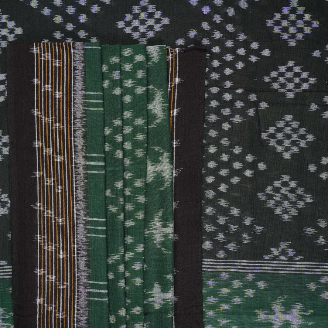 Embrace the heritage of Odisha with this stunning Sambalpuri cotton saree, where vibrant green meets deep black in a symphony of traditional motifs. Handcrafted using the meticulous Bandha technique, each thread showcases the unparalleled skill of our master weavers, ensuring a drape that is as breathable as it is elegant. Perfect for the woman who seeks a blend of professional poise and cultural pride, this saree is a testament to timeless handloom artistry.