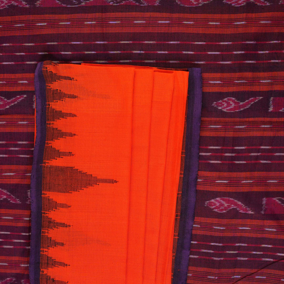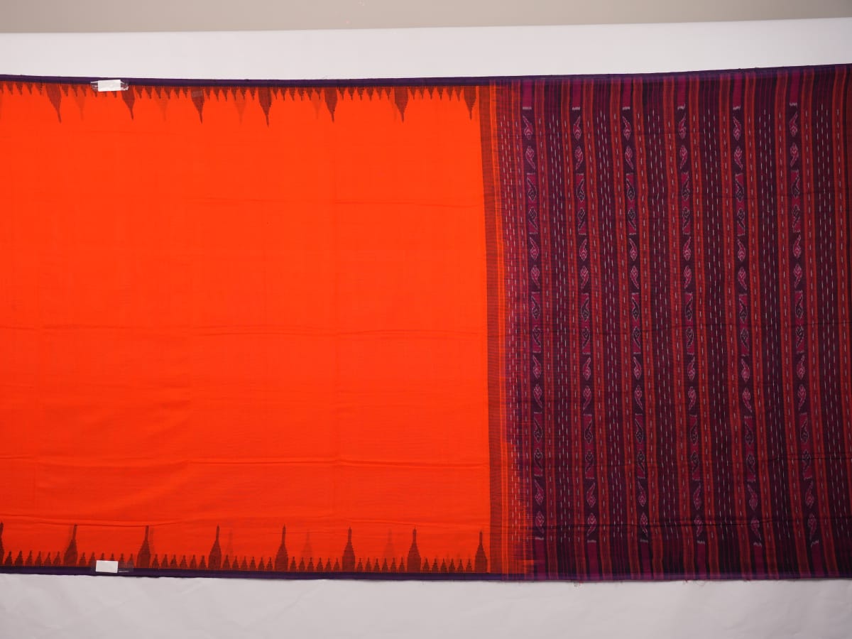 Embrace the understated elegance of Odisha's weaving heritage with this hand-loomed Sambalpuri cotton saree. The vibrant orange body is beautifully framed by a sophisticated blue narrow border, offering a minimalist yet powerful aesthetic for the modern professional. Meticulously crafted by skilled artisans, this piece celebrates the purity of cotton and the enduring charm of traditional craftsmanship, making it a soulful addition to your curated wardrobe.